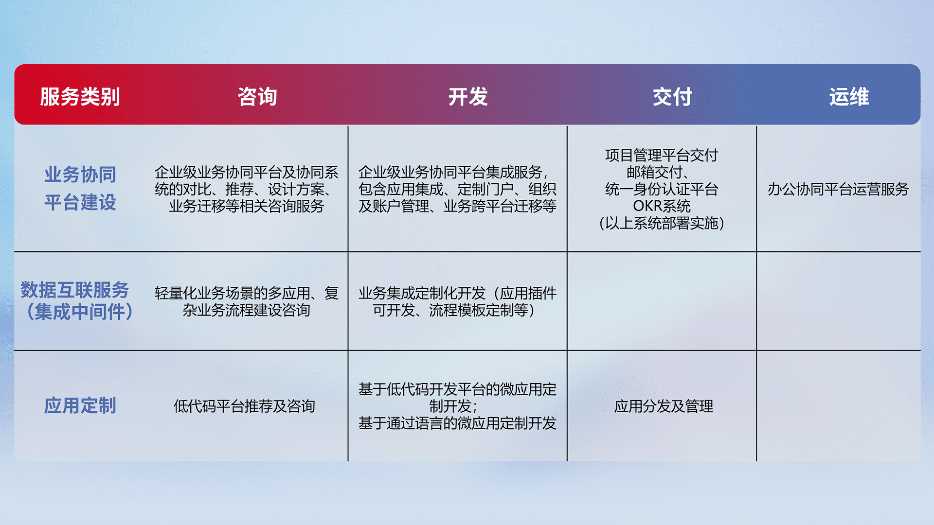 针对钉钉、、企微、、、IDaas等平台级产品提供产品的规划、、、、方案、、交付、、、定制化开发等服务,,,实现如统一协同办公、、、智能客户服务、、混合会议管理、、、智能数据查询、、等业务场景,,,实现数字化转型。。。