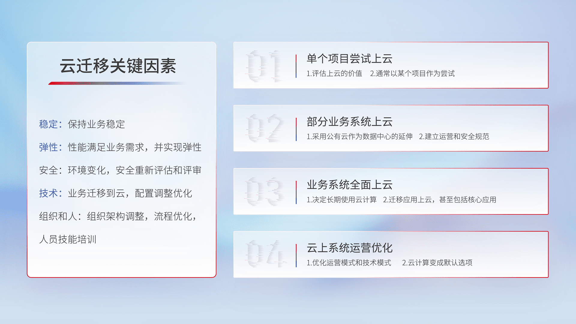 结合实际业务,,从规划设计、、、云平台选型、、、云原生改造、、数据迁移、、集成交付,,,,迁移全过程为客户识别最佳上云路径,,,,做好风险识别管理,,,设计网络架构、、、、身份权限、、、安全审计合规、、、操作审计、、、、日志审计、、、监控告警策略、、多站点容灾设计等,,,对云上基础设施进行整体规划,,,,提升IT治理水平,,,以满足弹性、、高可用、、高性能的需求。。。。