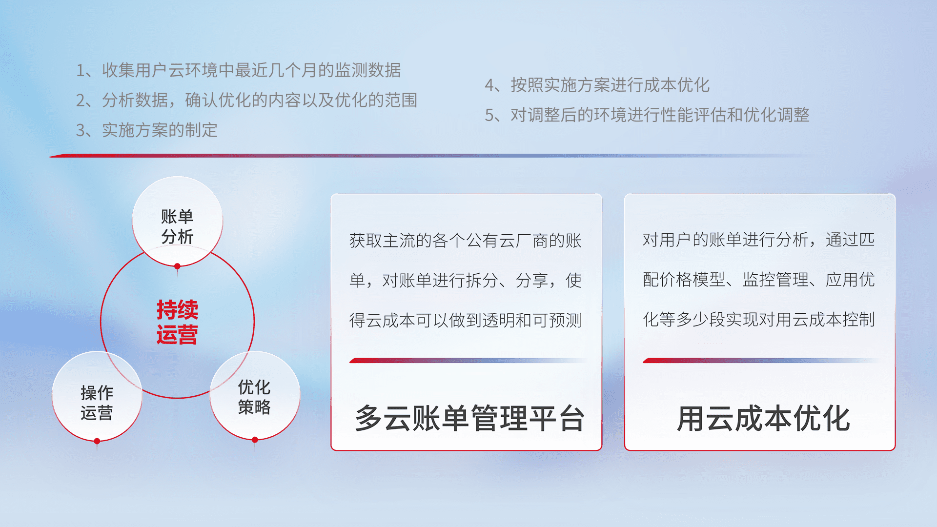 通过多云纳管,,以统一的资源数据模型把客户的云资源进行抽象和封装,,进而实现对多云资源的统一操作,,保障云资源管理的可靠性、、稳定性与可用性。。。量身定制化运维内容,,,配置、、开发运维、、补丁管理、、、备份、、监控、、认证和访问管理、、审计和日常巡检等,,保障在用云过程中的可靠度,,,稳定度以及高可用率。。。。